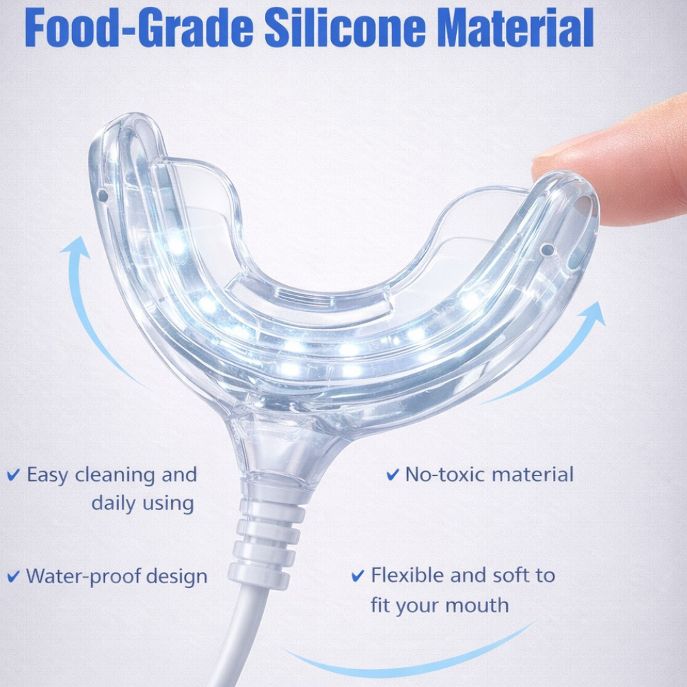 Die ingeslote mondbak is gemaak van buigsame, voedselgraad silikoon vir 'n veilige en gemaklike pasvorm. Dit help om die witmaakgel eweredig in plek te hou en verminder lekkasie tydens behandeling.